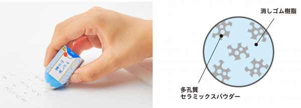 色の違う2層構造の樹脂で作られており、左右・前後方向にバランスよく消していくと本体が山形になり、雪化粧した富士山の山頂が現れます。自分だけの富士山を作ることができ、“消す”行為そのものが楽しくなる新しい発想の消しゴムです。「エアイン」シリーズ同様、多孔質セラミックスパウダーを練りこんだエアイン樹脂を使用することで、抜群の消字性能とエアーが生み出す軽い消し心地を実現。“よく消える“機能と“消す楽しみ”を両立しています。