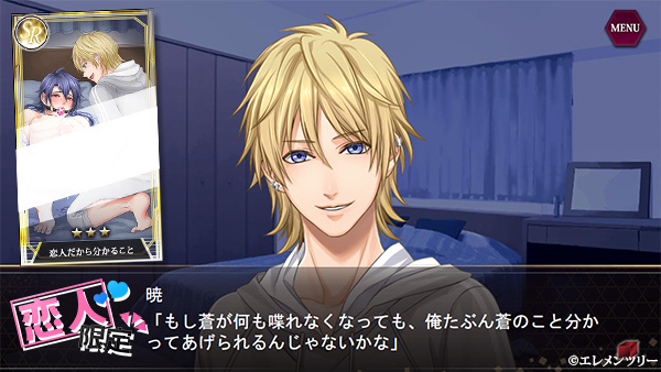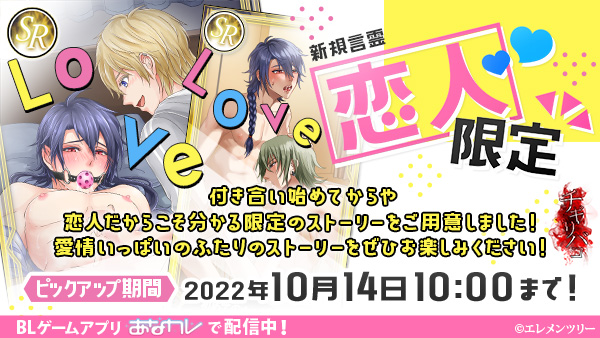 株式会社エレメンツリー(代表取締役:小川 邦弘、所在地:大阪市中央区)は、2022年9月30日にホラーBLゲーム『チギリバコ』(CV.四ツ谷サイダー、鳩マン軍曹etc)言霊「恋人限定」の提供を開始しました。