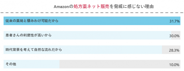 ・Amazonの処方薬ネット販売を脅威に感じない理由の1位は「従来の薬局と棲みわけ可能だから」で31.7%