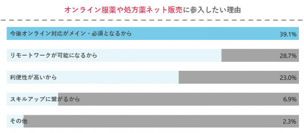 ・薬剤師としてオンライン服薬指導や処方薬ネット販売に参入したい理由の1位は「今後オンライン対応がメイン・必須となるから」で39.1%