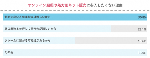 ・薬剤師としてオンライン服薬指導や処方薬ネット販売に参入したくない理由の1位は「対面でないと服薬指導は難しいから」で30.8%