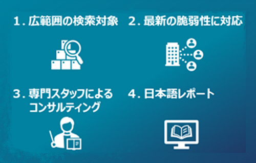 さらに、脆弱性情報の公表から平均24時間以内の脅威に対しても検知が可能で、最新のサイバーセキュリティリスクに対応します。16万件を超える脆弱性情報が自動アップデートされることで、精査・検査、修正に費やす時間を大幅に削減できます。また、脆弱性に関わる情報には英語の文書が多くあるため、クラウドとセキュリティに特化したJTPスタッフがコンサルティングや日本語での診断レポートを提供し、専門用語や言語の面でご支援します。
