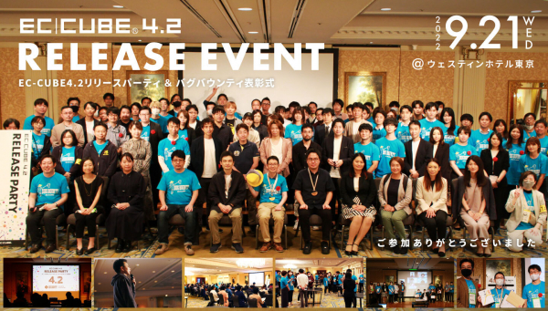 EC-CUBE4.2リリースパーティ 兼 バグバウンティ表彰式を2022年9月21日、ウェスティンホテル東京で開催いたしました。約100名の方々にご参加いただき、EC-CUBEからの発表、バグバウンティ表彰式、EC-CUBEでは2年半ぶりとなるオフラインでのコミュニティ同士のネットワーキングを実施いたしました。EC-CUBE4.2への期待度の高さが伺え、今後もより一層EC-CUBEコミュニティが盛り上がることを予感させる盛況なパーティとなりました。