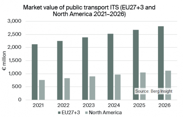 Berg Insightでは、欧州と北米の2地域におけるバスおよびトラム向けITSは2021年の28億8,000万ユーロから2026年までには年平均成長率6.4%となる39億3,000万ユーロに達すると予測しています。