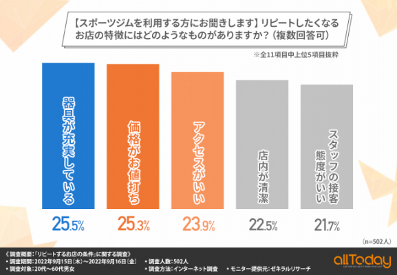 株式会社オールトゥデイ(本社所在地:埼玉県さいたま市)は、20代〜60代男女を対象に【スポーツジム編】「リピートするお店の条件」に関する調査を実施しました。その結果を公表します。