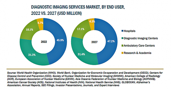 画像診断サービスの市場規模は、2022年の5490億米ドルからCAGR5.1%で成長し、2027年には7026億米ドルに達すると予測されています。市場成長の主な要因としては、各種慢性疾患の発生率の上昇、画像診断法に関する認知度の向上、外来画像診断センターの拡大が挙げられます。