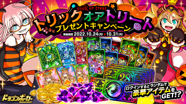 『ドラゴンポーカー』で「トリックオアトリートプレゼントキャンペーン」を10月24日(月)より開催!毎日ログインして豪華アイテムをGET!