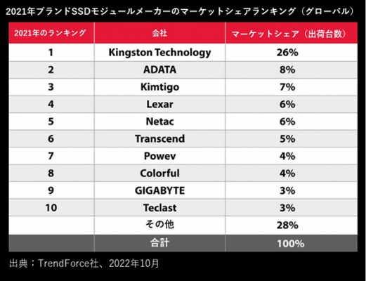 台北市、2022年10月25日 - メモリストレージ製品および技術ソリューションの世界的リーダーであるKingston Technology(https://www.kingston.com/jp) は本日、TrendForce(https://www.trendforce.com/presscenter/news/20221013-11422.html) から同社が2021年全体のチャネル市場でのSSDのサードパーティサプライヤーのトップに選出されたことを発表しました。TrendForceによると、2021年に出荷された1億2,700万台のSSDのうち、実に26%をKingstonの製品が占めています。