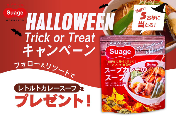 北海道スープカレーSuageを提供する株式会社Suage Japan(代表取締役:服部 峻介 所在地:東京都)では、2022/10/24-2022/10/31の間、Twiterにてハロウィーン特別プレゼント企画を開催致します。