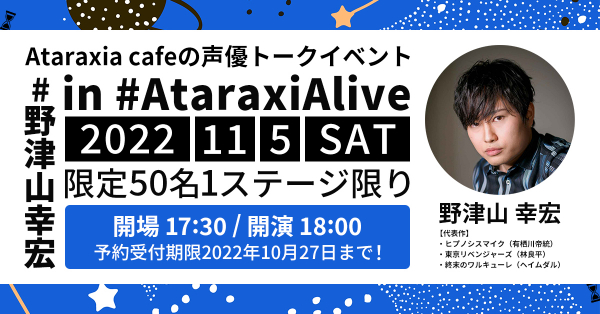 大人気男性声優『野津山幸宏』さんが出身地である大阪の日本橋にあるオタク女子専用カフェサロンに来店致します。一般人&男子禁制のオタ女の為のカフェサロンがコンセプトの「Ataraxia cafe」(アタラキシアカフェ) が1ステージ限定のスペシャルトークショーイベント『AtaraxiAlive』(アタラキシアライブ)を開催致します。