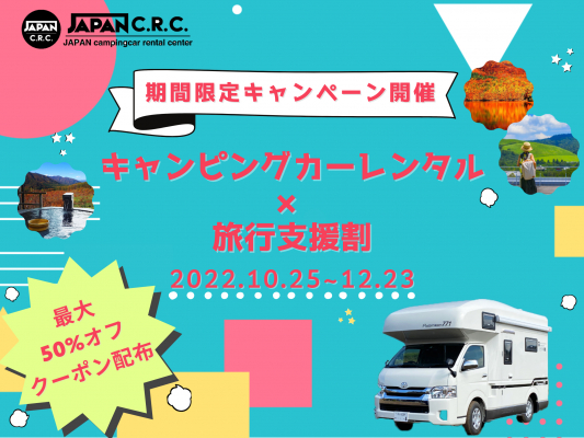日本最大級のキャンピングカーのレンタル事業「ジャパンキャンピングカーレンタルセンター(以下 JAPAN C.R.C.)」を運営するキャンピングカー株式会社(本社:東京都渋谷区 代表取締役社長:頼定 誠)は、2022年10月25日(火)〜2022年12月23日(金)のレンタル利用を対象に、20組限定でレンタル料金が最大50%割引になる「キャンピングカー旅行支援割」を実施いたします。