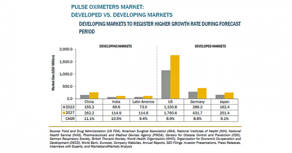 パルスオキシメーターの市場規模は、2022年の28億米ドルからCAGR8.8%で成長し、2027年には43億米ドルに達すると予測されています。同市場の成長は、外科手術の増加、老年人口の増加、慢性疾患の発生率の増加などにより牽引されています。