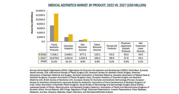 メディカルエステの市場規模は、2022年の139億米ドルからCAGR11.0%で成長し、2027年には234億米ドルに達すると予測されています。男性の間で美容治療の需要が高まっており、同市場の成長を促進しています。また、低侵襲および非侵襲の美容処置の採用が増加していること、老人の間で美容処置の採用が増加していること、技術的に高度でユーザーフレンドリーな製品が利用できることなどの要因も市場の成長を後押ししています。一方、代替美容・化粧品の入手可能性と人気、医療美容手術に関連する臨床リスクが、市場の成長を制限しています。