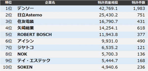 【自動車部品】特許資産規模ランキング2022トップ3はデンソー、日立Astemo、住友電装