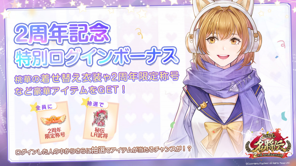 期間中毎日ログインすることで、「桃華」の新衣装や2周年限定称号などのレアアイテムを獲得することができます。