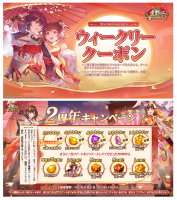 11月10日(木)と11月19日(土)の2回、2周年を記念した豪華なアイテムや元宝が入手できる「スペシャルシリアルコード」を公式Twitter(https://twitter.com/meishodenJP)上にて公開いたします。