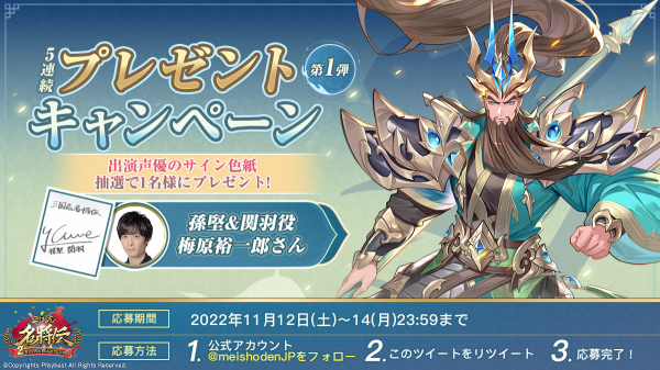 公式Twitterアカウント(https://twitter.com/meishodenJP)をフォローし、対象のキャンペーンツイートをリツイートしていただいた方の中から、抽選で『三国志名将伝』出演声優の直筆サイン色紙をプレゼントします。