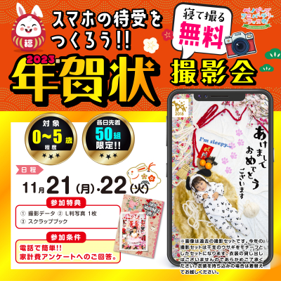 デザイナーが年賀状のテーマでデザインした背景で、プロカメラマンが無料で撮影します。今回は待ち受けにピッタリな縦型のデザインとなっており、年賀状にも使える撮影データとL判写真1枚をプレゼント。年賀状デザインのスクラップブックも差し上げます。