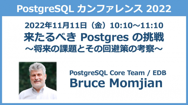 PostgreSQL コミュニティのコアメンバーで、EDB副社長兼Postgresエバンジェリストを務めるブルース・モンジン(Bruce Momjian)が来日し、2022年11月11日(金)に東京で開催されるPostgreSQL Conference Japan 2022にて「来たるべき Postgres の挑戦(Future Postgres Challenges)」と題する基調講演(英語:逐次通訳あり)を行います。