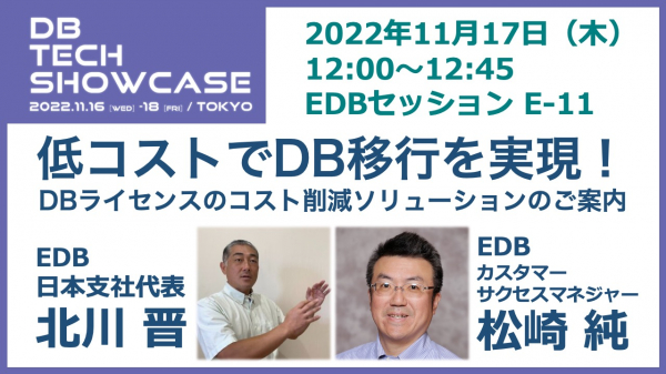 EDBは、11月16日(水)〜18日(金)までオンラインで開催される db tech showcase 2022で講演し、DBライセンスのコスト削減ソリューションをご紹介いたします。