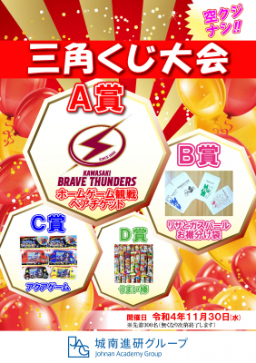 今回出展する城南進学研究社ブースでは、オレンジリボン運動としてビラを配布すると同時に、「川崎ブレイブサンダースホームゲーム観戦ペアチケット」など、さまざまな景品が当たる三角くじ大会を実施。児童虐待という現実があること、そしてオレンジリボン活動を知ってもらうため、多くの方のご参加をお持ちしています。