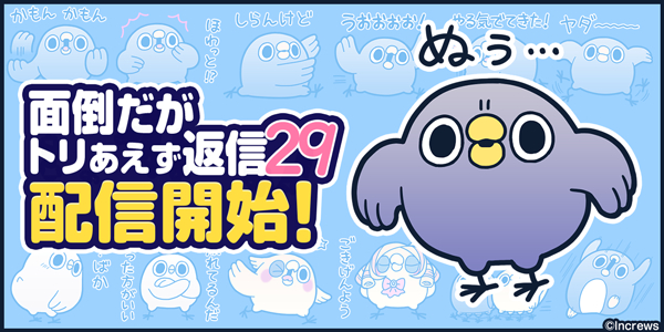 株式会社インクルーズ(東京都渋谷区、代表取締役社長 山? 健司)は、LINE株式会社(東京都新宿区、代表取締役社長 出澤 剛)が運営するコミュニケーションアプリ「LINE」内のスタンプショップにて、LINEスタンプ「面倒だがトリあえず返信29」を2022年11月25日(金)に配信開始致しました。