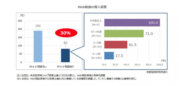 展開している店舗数別でWeb相談の導入率をみると、100店舗以上の企業6社が全て導入(100.0%)に対し、0〜2店舗の企業の導入率は17.5%(32社)にとどまり、店舗展開数による導入格差があることが分かった。一方で、数店舗展開の小規模地場企業から全国展開する大規模企業まで、店舗数に関係なくWeb相談を採り入れている。