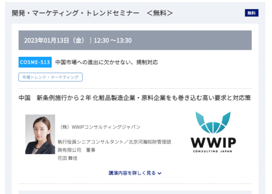 第13回 化粧品開発展[東京] -COSME Tech 2023 [TOKYO]-公式セミナープログラムでの講演のお知らせ <WWIPコンサルティングジャパン>