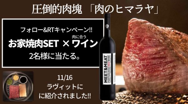 株式会社ノムノ(本社:東京都港区 代表取締役社長:蔵石 周太)は11月29日(火)より、TBS系ラヴィットで紹介され話題の『肉のヒマラヤ』のお家で楽しめる焼肉とワインのセットを、Twitterキャンペーンでプレゼントいたします。数々のTVやメディアでも取り上げられた、肉塊のインパクトと味、そしてワインとのペアリングを是非ご堪能ください。