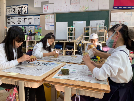 今年5月から、同校の4年生が校内にてヘチマ栽培を開始し、約半年間の水やり等のお世話を経て、実ったヘチマを乾燥させ、ヘチマたわし作りを行いました。作り方の説明後、皮を剥いて、種を取り出し、麻ひもを通して、ヘチマたわしを完成させました。
