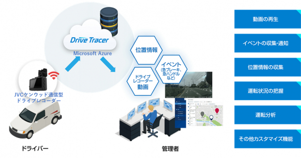 「Drive Tracer」ソリューションは、JVCケンウッド社製通信型ドライブレコーダー、マイクロソフトが提供するクラウドプラットフォーム Microsoft Azureに、NSWの「Drive Tracer」サービスを組み合わせたIoTテレマティクスサービスです。車両の運行情報をクラウドで一元管理し、その情報を基に危険運転事象のリアルタイム検出やドライバーモニタリングなどの安全運転管理といった各種業務・サービスのDX実現を支援します。また、お客様の運用に応じて、車両管理や点呼、健康管理といったすでに活用しているシステムとの連携や、独自のフリートマネジメント※2システムの構築など、カスタマイズにも柔軟に対応します。