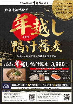 関西を中心にラーメン店「ちゃんぽん亭総本家」などを全国へ展開するドリームフーズ株式会社(本社:滋賀県彦根市、代表取締役社長:山本英柱、以下、当社)が展開する、地元・滋賀県の多賀町産蕎麦粉を使用した「多賀蕎麦」を提供している蕎麦店「金亀庵」(こんきあん)では、2022年11月30日(水)12:00〜12月14日(水)の期間、テイクアウト専用の年越し蕎麦セット『近江鴨の年越し鴨汁蕎麦』を100セット限定で予約販売いたします。
