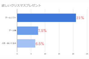 21%が「ゲームソフト」を、7.5%が「ゲーム機」を、6.5%が「人形・ぬいぐるみ」を欲しいという結果になった。「ゲームソフト」が欲しいと回答した人数は「ゲーム機」が欲しいと回答した人数の約3倍だったことから、ゲーム機をすでに持っている子どもが多いことや、クリスマスにもらうプレゼントはそれほど高価なものを求めないことが予想できる。