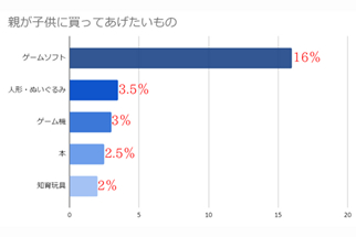 16%が「ゲームソフト」、3.5%が「人形・ぬいぐるみ」、3%が「ゲーム機」、2.5%が「本」、2%が「知育玩具」を買ってあげたいという結果になった。本や知育玩具といった教育に関わるものよりもゲームソフトやゲーム機・ぬいぐるみなどといった遊ぶものを買ってあげたいという保護者の方が多い傾向があると言える。また、共働き世帯の増加や少子化によって一人で遊ぶ時間が増えたことも影響しているのではないかと考えている。