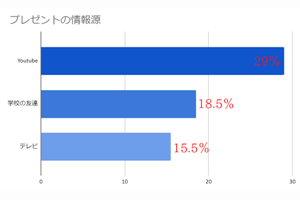 29%が「YouTube」、18.5%が「学校の友達」、15.5%が「テレビ」をプレゼントの情報源としているという結果になった。テレビよりもYouTubeで情報を集めている人が多いことからテレビ離れがうかがえる。