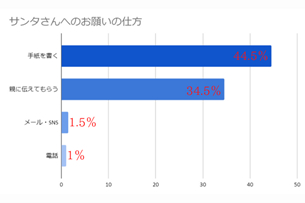 44.5%が「手紙を書く」、34.5%が「親に伝えてもらう」、1.5%が「メール・SNS」、1%が「電話」でお願いしているという結果になった。サンタさんへのお願いの仕方は、SNSやスマホが発達した今でも手紙や直接伝えてもらうというような方法がとられていることが多いということが分かった。
