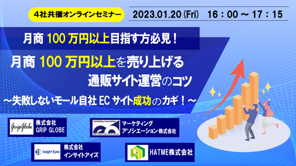 2023年01月20日(金)に開催される、【通販1年未満の事業者向け】月商100万円以上を売り上げる通販サイト運営のコツ!に、ECサイトの運営代行サービスを提供しているマーケティングアソシエーション株式会社(本社:東京都台東区 代表取締役:中園広和、以下当社)が登壇いたします。
