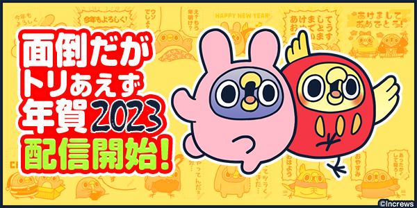 株式会社インクルーズ(東京都渋谷区、代表取締役社長 山? 健司)は、LINE株式会社(東京都新宿区、代表取締役社長 出澤 剛)が運営するコミュニケーションアプリ「LINE」内のスタンプショップにて、LINEスタンプ「面倒だがトリあえず年賀2023」を2022年12月22日(木)に配信開始致しました。