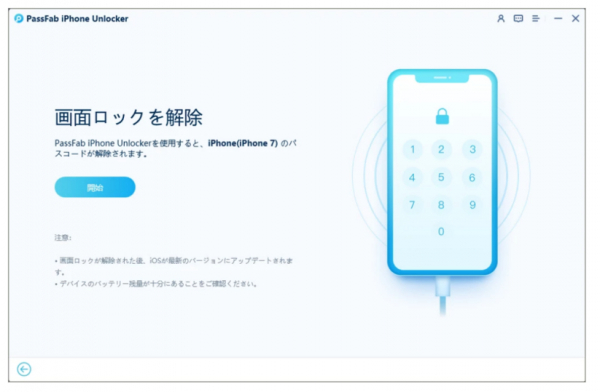 Step1:PassFab iPhone Unlockをパソコンにダウンロードして起動し、「解除開始」をクリックします。