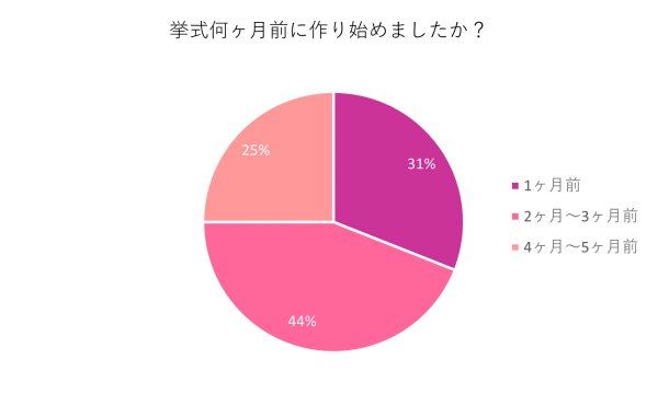 「1ヶ月前」31%、「2ヶ月〜3ヶ月前」44%、「4ヶ月〜5ヶ月前」25%でした。