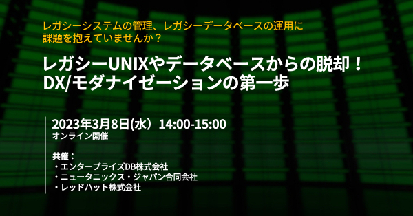 エンタープライズDB(以下EDB)は「レガシーUNIXやデータベースからの脱却! DX/モダナイゼーションの第一歩」共同ウェビナーをNutanix、Red Hat と2023年3月8日(水)に共催いたします。