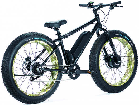 特筆すべきはバーファン製36V/350Wの強力なモーターを前輪軸(フロントハブ)に装備し、両輪駆動としたことです。人力のペダリングパワーと電動のアシストパワーを前後輪で振り分けることで、不整地や滑りやすい路面も力強く走破することが可能な設計となっています。この踏破力を最大限に発揮するため、タイヤには電動アシスト自転車としては国内最太(弊社調べ)となる4.75インチのVEE TIRE製ブロックタイヤを採用しました。変速にはマイクロシフトの9段変速を採用し、ブレーキには油圧ディスクブレーキを装備。前述の2WDシステムと併せて、アクティブに“走れる”仕様となっています。