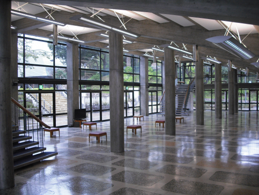 ガラスと細いコンクリート柱で囲まれ、光溢れるホワイエは、前川國男の建築デザインを象徴する場所でもある。この日一日、この音楽堂のホワイエに音が溢れる。