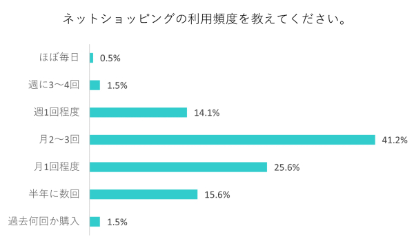「ほぼ毎日」0.5%、「週に3〜4回」1.5%、「週1回程度」14.1%、「月2〜3回」41.2%、「月1回程度」25.6%、「半年に数回」15.6%、「過去何回か購入」1.5%という結果でした。