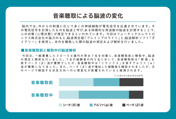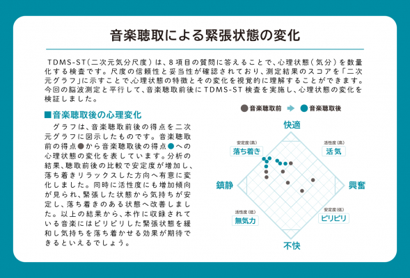 今回はフューテックエレクトロニクス株式会社の協力のもと、脳波測定器「ブレインプロライト」と、脳波解析ソフト「ダイアリー」を使用し、本作を聴取した際の脳波の測定および解析を、平行して、音楽聴取前後にTDMS-ST検査を実施し、心理状態の変化を検証しました。