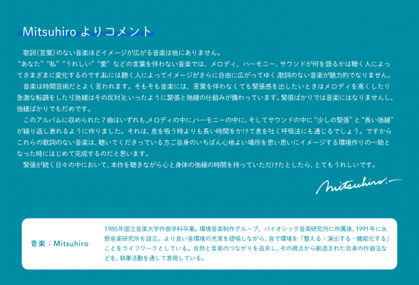 日々の緊張緩和に「からだにいいおと」を、検証を経て制作された、セラピー・ミュージック。