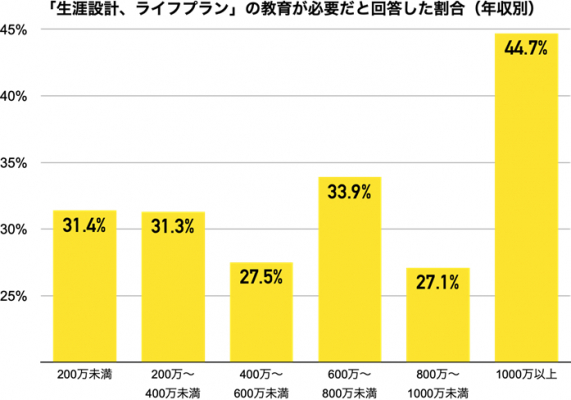 これらの結果から、世帯年収が1000万円以上の人は、子どもたちにライフプランを明確にして必要な資産運用に取り組めるようになることを、より強く望んでいると思われます。高校の授業で「資産形成」が必修化されたことについては様々な意見がありますが、年収1000万円以上の人では多くが歓迎している可能性が高いと考えられます。