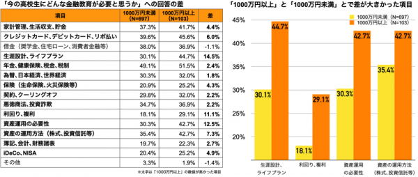 「金融教育に望むもの」年収による違いが明確に 年収1000万円以上の人が重視するのは「貯金」よりも 「生涯設計、ライフプラン」「資産運用の必要性」