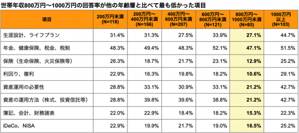 世帯年収1000万円以上の人が、1000万円未満の人よりも金融教育への関心が高いことが分かりましたが、世帯年収に比例して関心が高まるのかというと、そうではないようです。世帯年収が800万〜1000万円では、他のどんな年収層よりも関心が下がる項目が多数ありました。