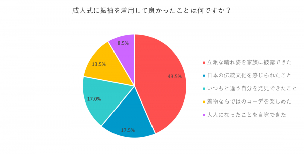 最も多かったのが「立派な晴れ姿を家族に披露できた」と回答した人で43.5%でした。次いで「日本の伝統文化を感じられたこと」17.5%、「いつもと違う自分を発見できたこと」17%、「着物ならではのコーデを楽しめた」13.5%、「大人になったことを自覚できた」8.5%となりました。